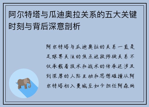 阿尔特塔与瓜迪奥拉关系的五大关键时刻与背后深意剖析